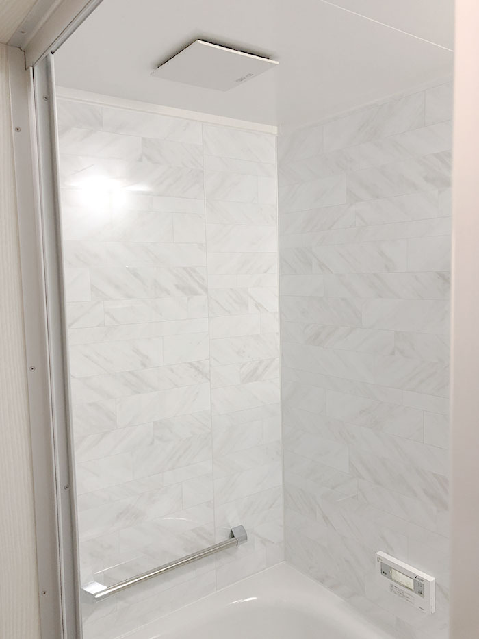 LIXILショールームで選ばれたパネルの組石ホワイトがとても綺麗で、高級感のある浴室へと生まれ変わりました!