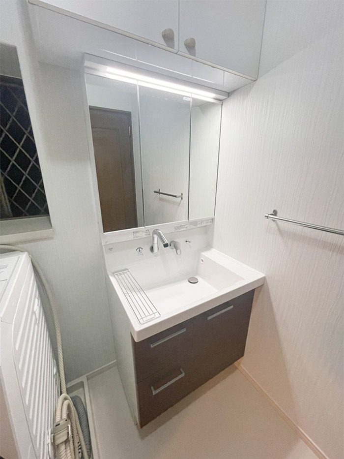 浴室:LIXIL アライズ Zタイプ 1616サイズ(パネルカラー:ウォールナット×シャインウッドホワイト) 洗面化粧台:LIXIL ピアラ 間口750mm(扉カラー:クリエモカ) クロス:サンゲツ SP 床材:サンゲツ クッションフロア 枠・木巾木:ダイケン ハピアシリーズ |