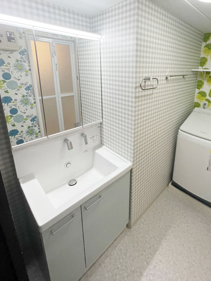 ユニットバス:LIXIL リノビオ Fタイプ 1216サイズ(パネルカラー:モザイクアクア) クロス:サンゲツ リザーブ クッションフロア:サンゲツ クッションフロア ソフト巾木:サンゲツ ソフト巾木 照明:Panasonic製 |