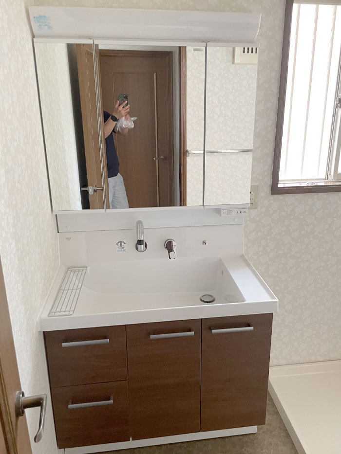 初めはユニットバスとガス給湯器の交換のご依頼でしたが、洗面化粧台も合わせてご提案させていただきました。内装も貼り替えてとてもキレイになったと思います。