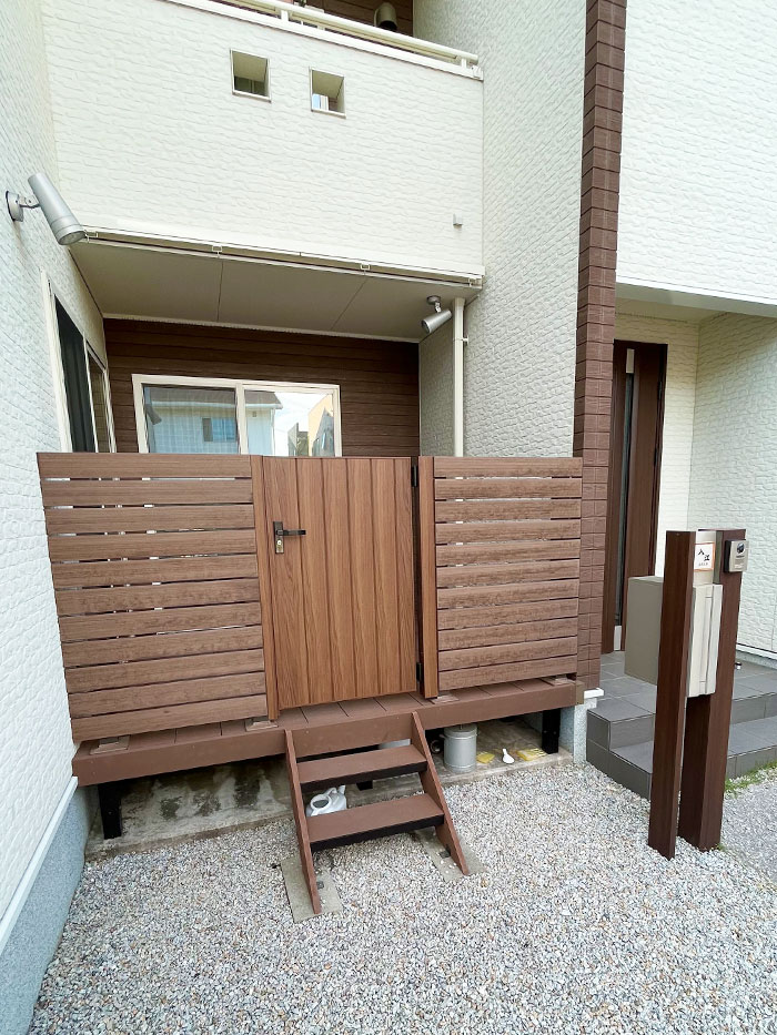 既存のウッドデッキにフェンス、門扉、日よけのスタイルシェードを取付させていただきました。
