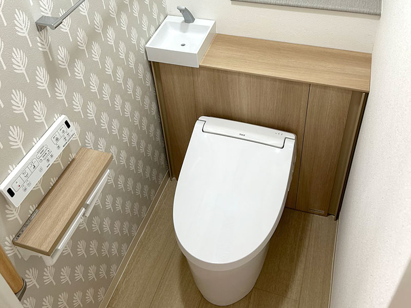 トイレの入り口側の壁には手すりも新たに設置させていただきましたので、立ち座りの負担が軽減され、今後も安心してお使いいただけるかと思います。
